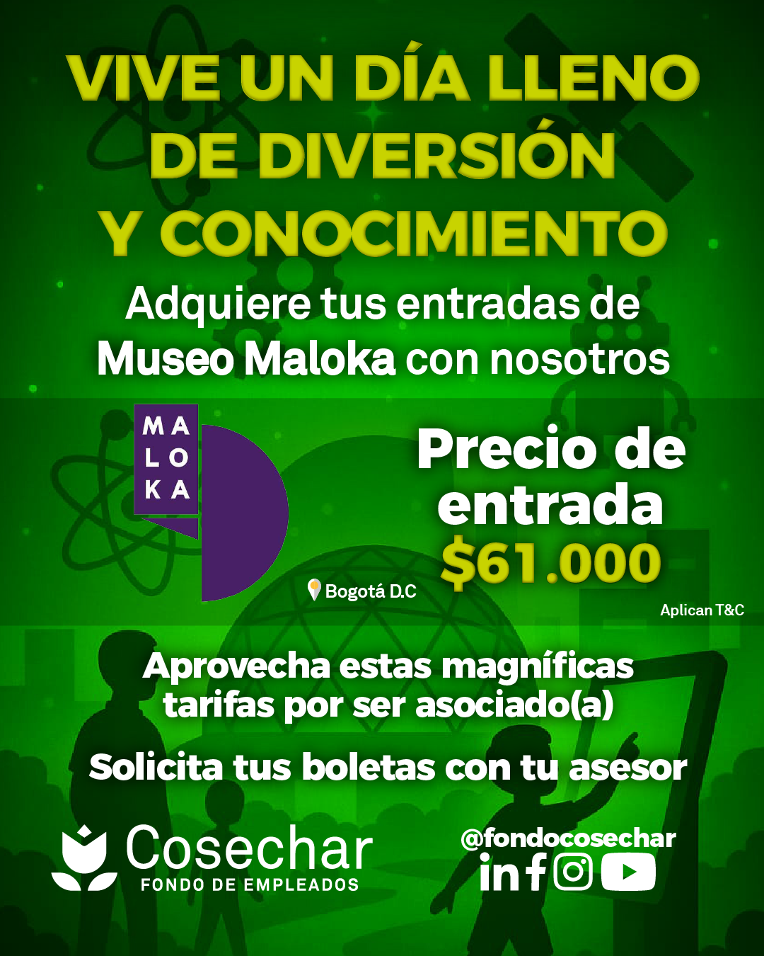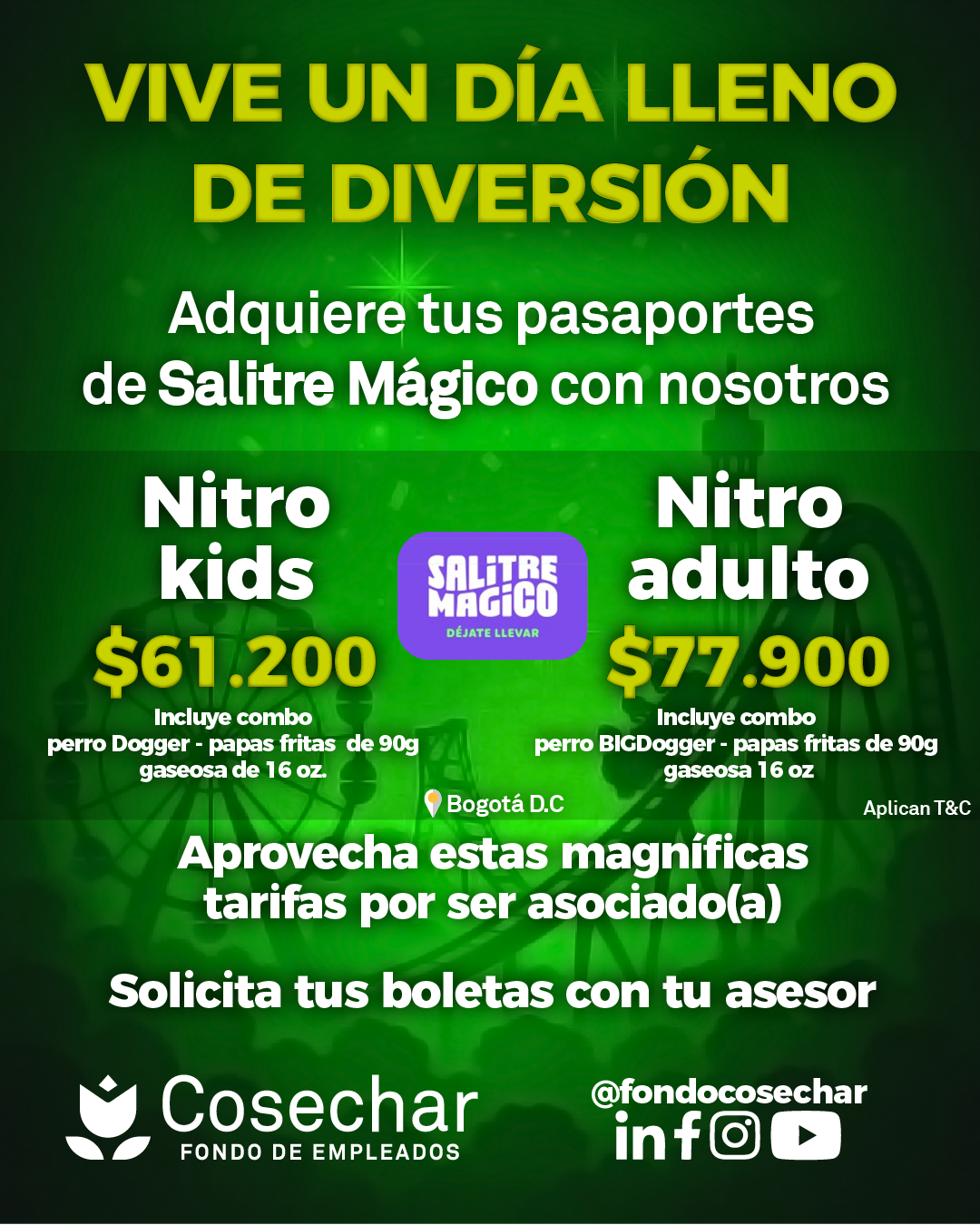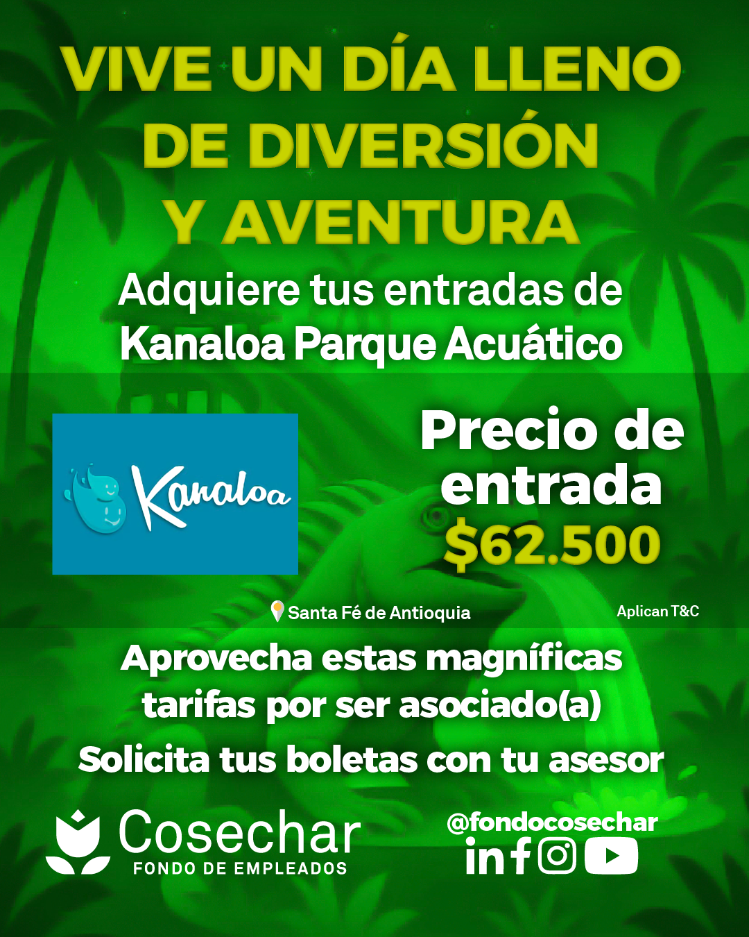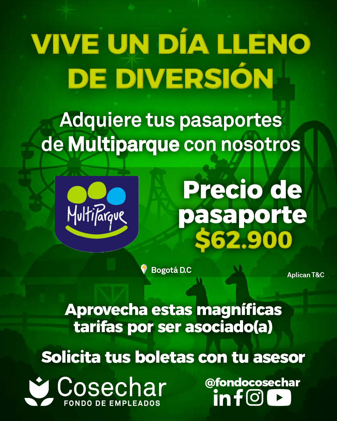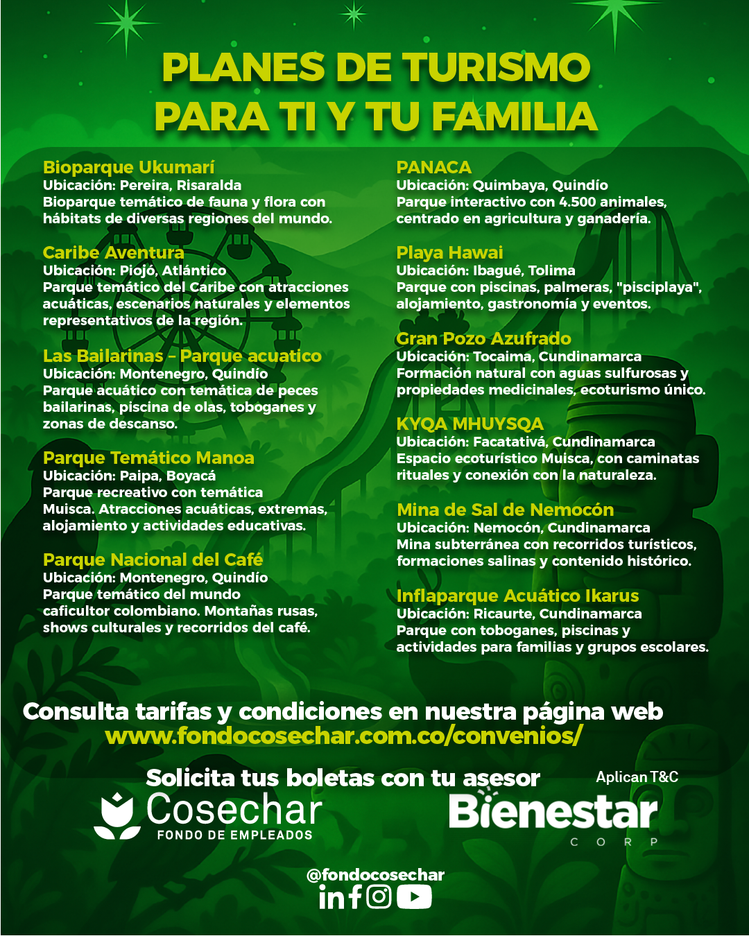 Además puedes disfrutar de excelentes tarifas en pasaportes para Hacienda Nápoles, Parque Explora, Kanaloa, Mundo Aventura, Salitre Mágico, Maloka, Piscilago y mucho más. También ofrecemos opciones de turismo nacional como Playa Hawai, Parque Nacional del Chicamocha, Parque Nacional del Café y mucho más.