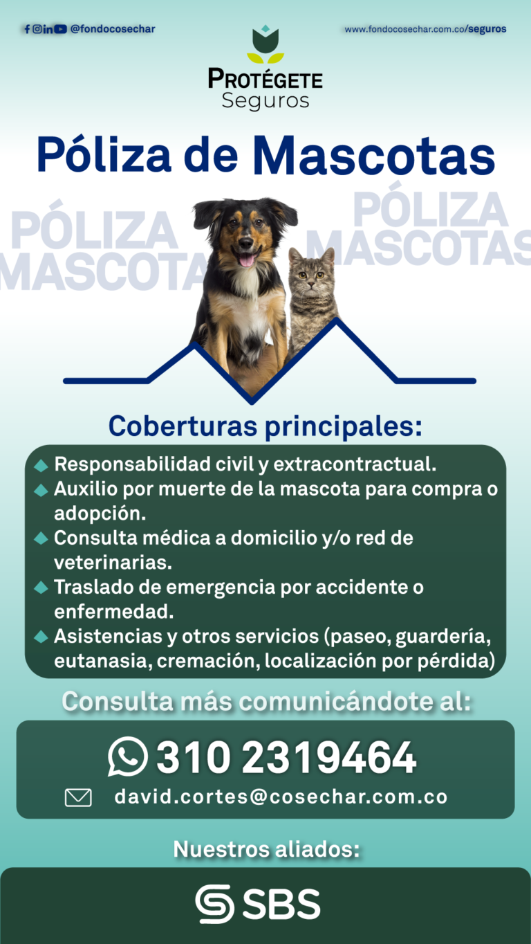 Esta póliza de mascotas es una solución diseñada para proteger a tu perro o gato ante imprevistos como enfermedades, accidentes o daños a terceros. Te ofrece tranquilidad al brindarte cobertura para gastos veterinarios, hospitalización, medicamentos, cirugías y mucho más. ¡Promueve una vida más larga y saludable para tu mascota!