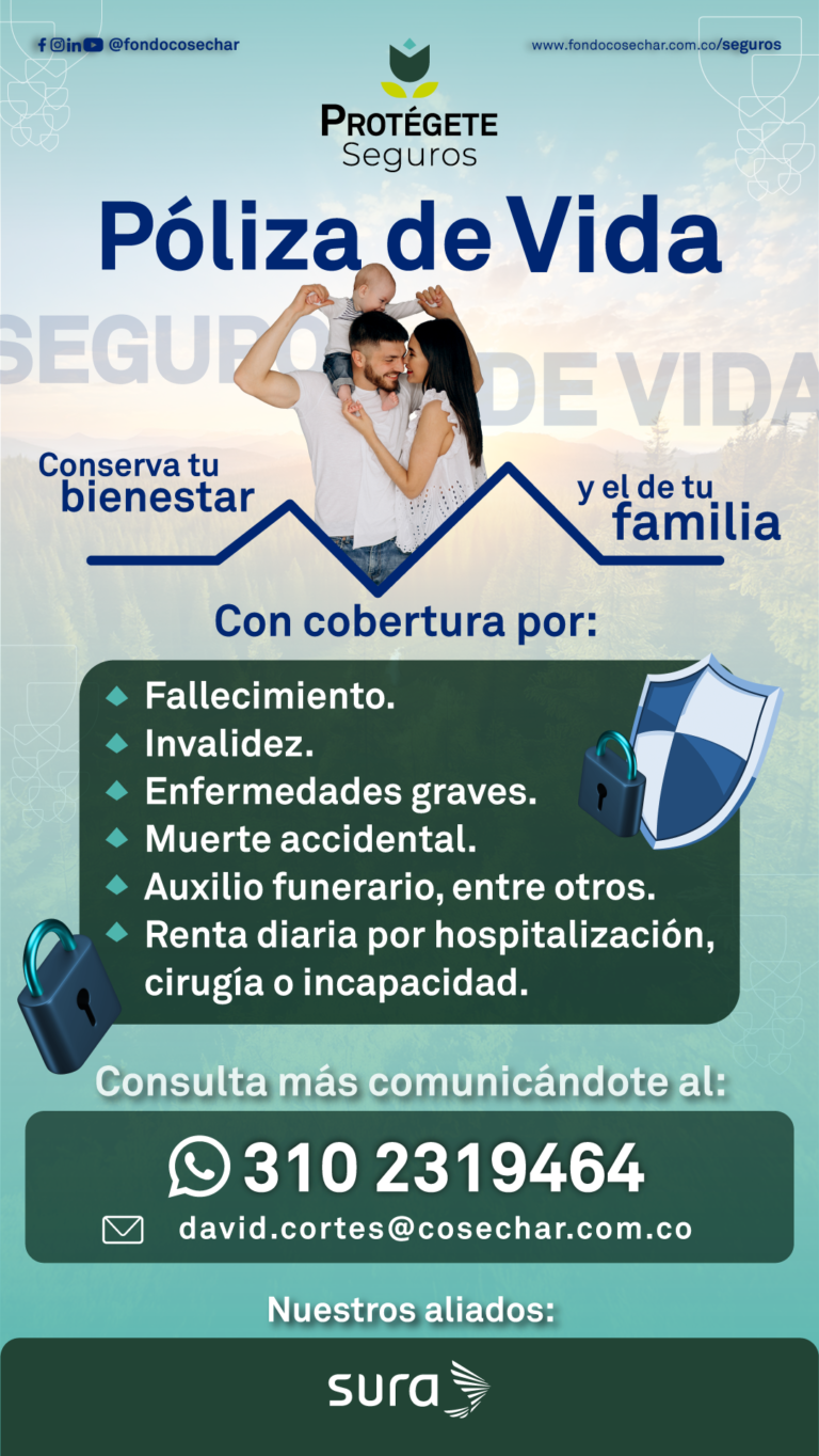 Una póliza de vida es una inversión para el futuro de tu familia, asegurando su bienestar financiero en caso de que tú faltes. Así, ellos podrán cubrir gastos funerarios, deudas, educación de los hijos, etc; garantizando una estabilidad económica. También incluye beneficios en vida en casos de invalidez, enfermedades graves, auxilios, entre otros.